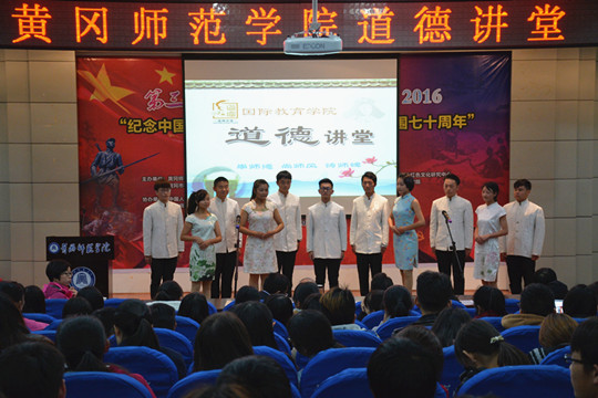 本期道德讲堂由国际教育学院承办,共设“唱一首歌曲”、“看一部短片”、“润一份心田”、“传一种力量”、“诵一段经典”、“写一份感言”、“做一个点评”等八个环节。