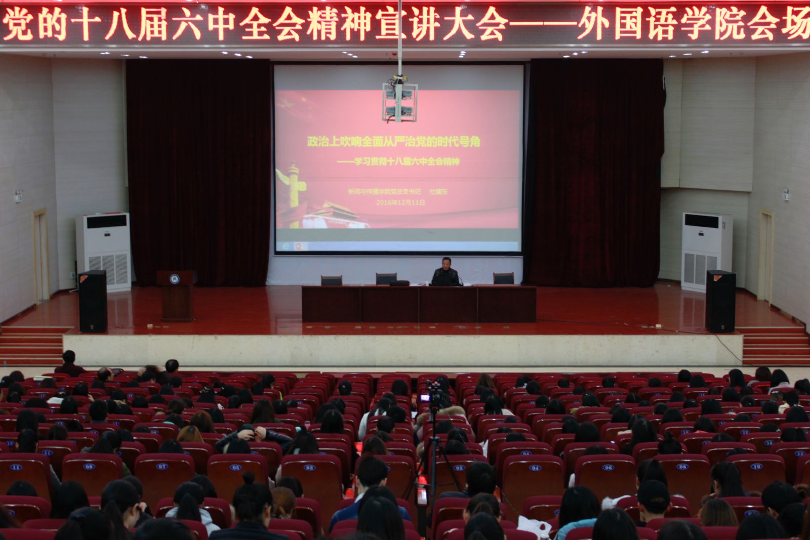 12月11日下午、20日晚,校内宣讲团成员、新闻与传播学院党总支书记杜建东在南区学术交流中心分别为外国语学院、商学院党员干部和师生员工作宣讲报告。杜建东以《政治上吹响全面从严治党的时代号角》为题,从“深刻把握六中全会精神的重大意义”、“全面把握《准则》的新思想与新要求”、“科学把握《条例》的新思想与新要求”、“准确把握突出抓好领导干部特别是高级干部‘关键少数’”四个方面对六中全会精神进行了解读。