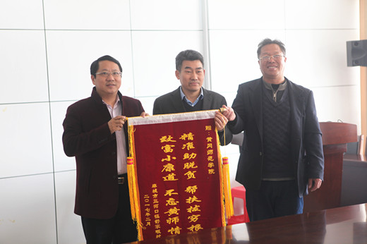 本网讯(通讯员 阙庆喜)2月16日,麻城市委常委占银安一行6人代表舒家畈村父老乡亲给我校送来一面写有“精准助脱贫,帮扶拔穷根,致富小康道,不忘黄师情”的锦旗,感谢学校在驻村帮扶工作中对舒家畈村的热心帮扶。校长陈兴荣、副校长马志斌出席座谈会。