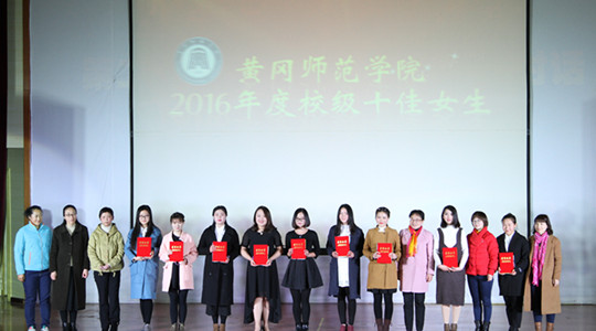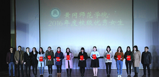 在颁奖环节,文学院何雅彬、外国语学院谢璟玥、美术学院张莉、音乐学院李佳璐、生命科学学院孙晨曦、体育学院沈丽勤、教育科学与技术学院阮娟、旅游文化与地理科学学院王梦晗、国际教育学院时绍轩被授予黄冈师范学院2016年度校级“十佳女生”荣誉称号,文学院方星移教授、周秀容教授,政法学院、马克思主义学院刘清教授,商学院周一萍教授等为“十佳女生”颁奖。政法学院赵芳芳、商学院叶欣欣、数理学院陈铭、计算机学院汪梦圆、化工学院鄢婷、新闻与传播学院肖明月、电子信息学院余榕、建筑学院段漾、交通学院李大容被授予黄冈师范学院2016年度校级“优秀女生”荣誉称号。