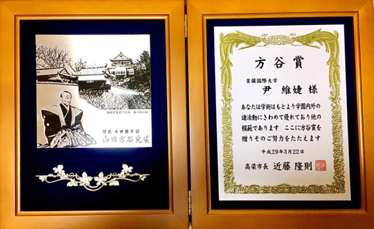 我校学生尹维婕荣获日本高梁市“方谷奖”