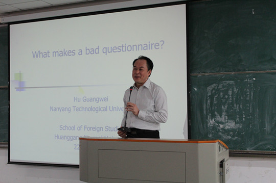胡光伟教授作了题为“What makes a bad questionnaire?”的专题讲座。他以大量生动有趣的真实案例,介绍了在调查研究中制作问卷所必须考虑的因素,重点分析了各类问题的作用与影响,并详细介绍了设计调查问卷过程中易犯的错误。