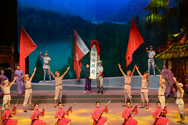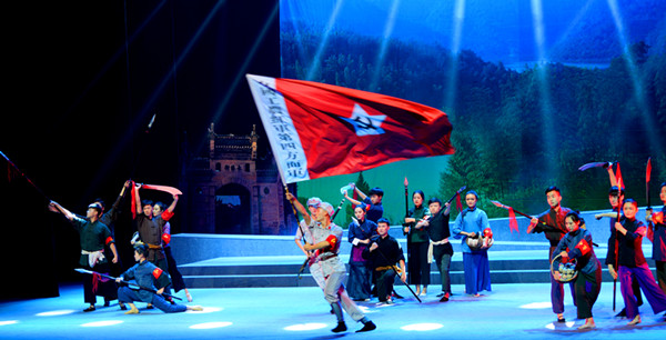 当高擎钢枪、奋勇向前的红军战士和身背大刀、高举铜锣的武装农民两尊雕像作为舞美背景展现在舞台上时,一段承载着几代人回忆的红色经典又一次重新“扬帆启程”。脍炙人口的红歌、悲壮感人的舞蹈、气势磅礴的合唱等多种艺术表现形式,带领观众们走进了那段艰苦卓绝的激情岁月。
