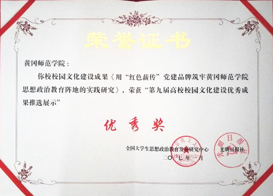 本网讯 日前,从全国大学生思想政治教育发展研究中心传来喜讯,在全国大学生思想政治教育发展研究中心、光明日报社共同举办的第九届全国高校校园文化建设优秀成果推选展示活动中,学校申报的校园文化建设成果《用“红色薪传”党建品牌筑牢黄冈师范学院思想政治教育阵地的实践研究》项目荣获优秀奖。学校大型原创音乐舞蹈史诗《红色薪传》剧目曾荣获2016年湖北省高校校园文化建设优秀成果特等奖。