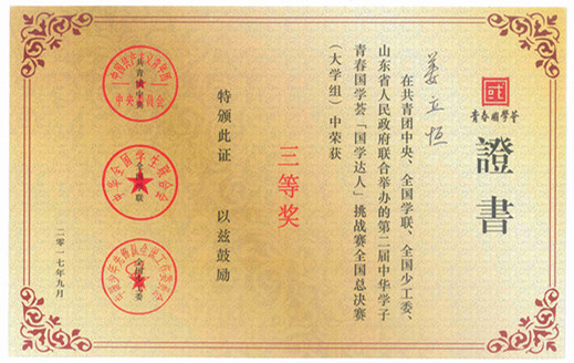 本网讯(通讯员 邓军)9月18日,由共青团中央、全国学联、全国少工委和山东省政府主办的第二届中华学子青春国学荟“国学达人”挑战赛总决赛暨中华学子优秀国学成果颁奖典礼在山东省曲阜杏坛剧场广场举行。经过激烈的角逐,我校文学院汉语国际教育1601班学生姜立恒代表湖北省大学组参赛,并获得三等奖。