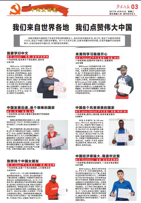 本网讯 10月24日,《鄂东晚报》第3版“十九大时光”栏目以《我们来自世界各地 我们点赞伟大中国》为题,通过对我校外国留学生的现场采访,报道了我校留学生群体为伟大中国点赞评论。