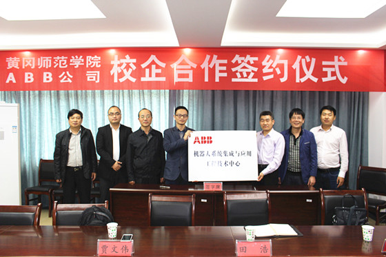 本网讯(通讯员 黄锋)10月26日,我校举行与ABB工程有限公司校企合作签约暨“ABB机器人系统集成与应用工程技术中心”、“黄冈师范学院专业教学实习基地”授牌仪式。副校长马志斌出席仪式。