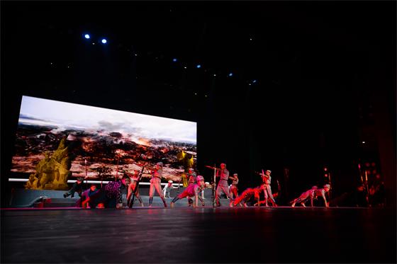 第二篇章“红土映日”展现了黄麻人民武装斗争的场景。1927年黄麻起义爆发,男女老少人人拿起武器,为保卫家园进行艰苦卓绝的斗争。演出者精湛地演绎出了当年黄冈人民全民上阵齐抗敌的感人一幕,拳拳爱家爱国之心让观众们动容。演出尾声,表演者通过原创歌舞表演,展现了几十年前董必武、陈潭秋等革命先辈点燃黄冈革命火种,到如今黄冈人民薪火相传至今仍生生不息的红色精神。演出在观众经久不息的热烈掌声中落下帷幕。