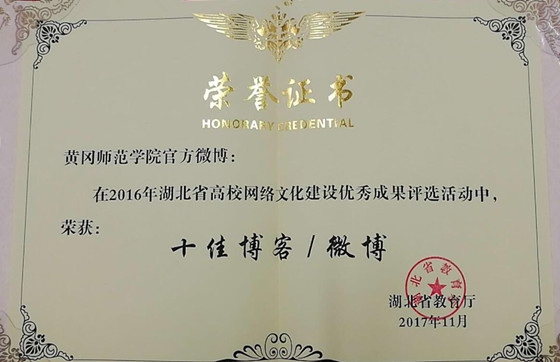 本网讯 11月29日,接教育厅(鄂教思政【2017】5号)《关于公布2016年度高校网络文化建设成果的通知》文件,我校官方微博(简称官博)获网络文化建设优秀成果奖,被评为全省高校“十佳微博”,党委宣传部老师被评为“优秀指导教师”。
