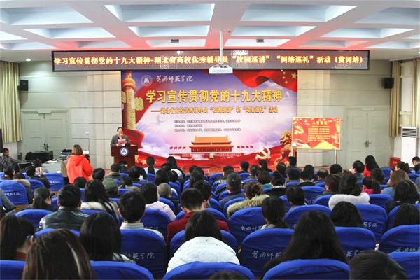 李金奇致辞。他指出,党的十九大召开以来,我校深入学习宣传贯彻党的十九大精神,切实把全校广大党员干部和师生员工的思想统一到十九大精神上来,把智慧、力量凝聚到十九大确定的各项目标任务上来。学校成立了党的十九大精神校内宣讲团,实现宣讲全覆盖,并把十九大精神贯穿于学校改革发展、人才培养全过程,着力推进十九大精神在黄师落地生根、开花结果。