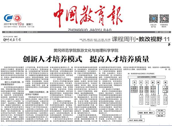本网讯 12月19日,《中国教育报》第11版课程周刊以《创新人才培养模式 提高人才培养质量》为题,从修订人才培养方案,作好制度顶层设计;构建分流培养模式,满足学生个性需求等两个层面报道了我校旅游文化与地理科学学院的应用型人才培养之路。