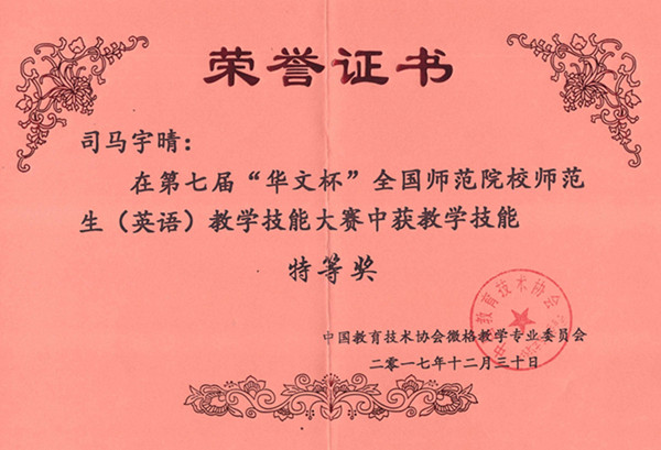 本网讯 2017年12月31日,第七届“华文杯”全国师范院校师范生英语教学技能大赛获奖结果揭晓,外国语学院2014级本科生司马宇晴获得教学技能特等奖,学科教学英语领域教育硕士研究生易思利获得教学设计一等奖,学科教学英语领域教育硕士研究生汪迪、英语本科生洪晨、周欣等分获教学技能和教学设计二、三等奖。於银梅、胡晓晏、王德志、蒲春红、岑海兵、汪晖、王后、汪艳、张慧芳、李丽等指导老师获得“优秀指导教师奖”。