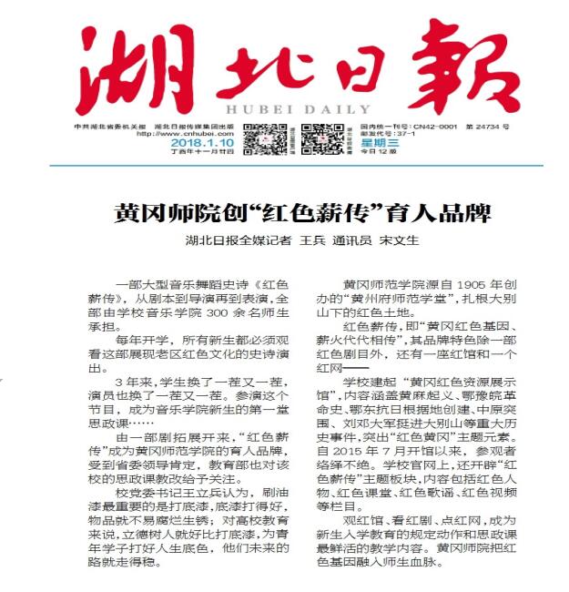 本网讯 1月9日至10日,《湖北日报》先后在微媒平台、纸媒第8版文化与体育分别以《为青年学子打好人生底色 黄冈师院创"红色薪传"育人品牌》、《黄冈师院创“红色薪传”育人品牌》为题,报道我校将“红色薪传”品牌融入思想政治教育全过程的理念、举措及成效。