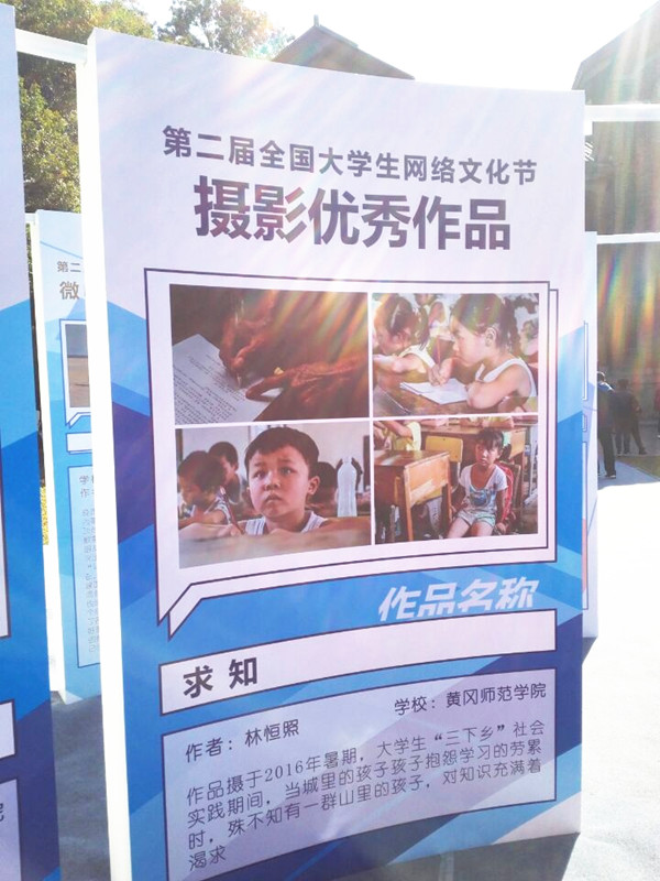 第二届全国大学生网络文化节的主题是“传递网络正能量、争做校园好网民”,共收到有效作品18981件,覆盖全国31个省(区、市)和新疆生产建设兵团1142所高校。全国共评出摄影类优秀作品一等奖10个。我校教育科学与技术学院学生、摄影协会记者林恒照的摄影作品《求知》荣获全国一等奖,同时在单项奖中荣获“最佳纪实奖”。《求知》拍摄于暑期大学生“三下乡”社会实践期间,当城里的孩子抱怨学习的劳累时,殊不知有一群山里的孩子,对知识充满着渴求,引发人们对现实生活的思考。我校学生王正行的摄影作品《快餐文化》获得全国优秀奖。
