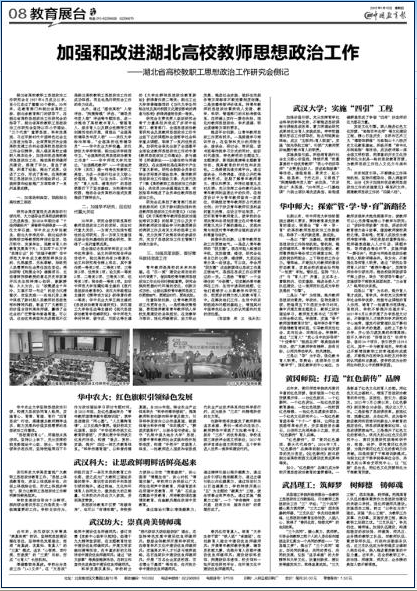 本网讯 1月18日,《中国教育报》第八版《教育展台》以《黄冈师院:打造“红色薪传”品牌》为题,介绍了我校在加强和改进思想政治工作方面采取的举措和取得的成效。该版还同时发布了武汉大学、华中师范大学、华中农业大学、武汉科技大学、武汉纺织大学等湖北省高校在加强和改进教职工思想政治工作上的实践探索情况。