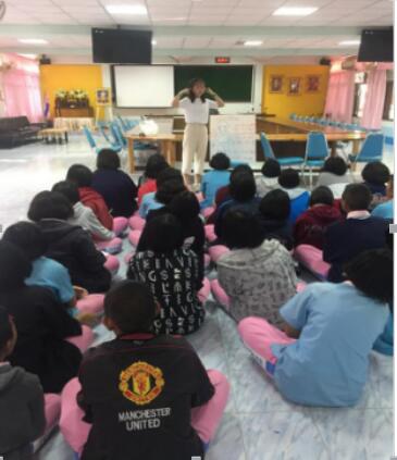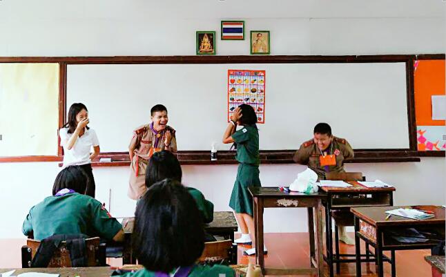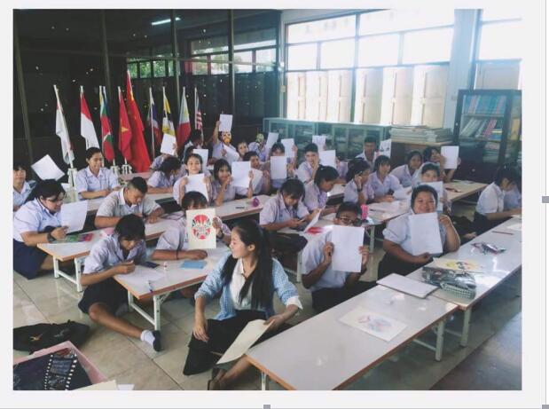 2016年5月,文学院对外汉语专业201201班刘婷婷同学(前排左一)受国家汉办选派,赴泰国Prateab中学进行汉语教学。图为中国文化课现场。