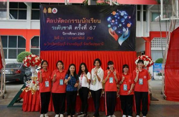 2016年5月,文学院对外汉语201201班刘婷婷同学(左三)受汉办选派,赴泰国Prateab中学进行汉语教学。图为带领学生参加北标府汉语比赛。
