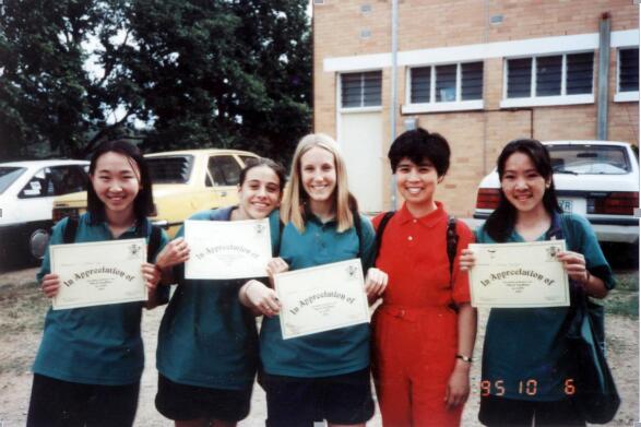 1995年4月至1996年4月,文学院谢岚岚老师(右二)受省教育厅公派,赴澳大利亚昆士兰省布里斯班市Toowang High School进行汉语教学。图为谢岚岚老师与在昆士兰中小学汉语大赛上获奖学生合影。