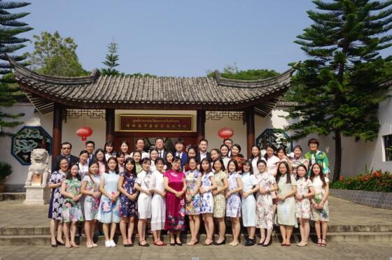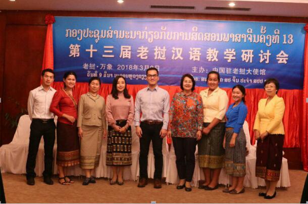 2017年12月,文学院陈娟老师(左三)受国家汉办选派,赴老挝国立大学语言学院中文系进行汉语教学。图为参加大使馆主办的第十三届老挝汉语教学研讨会,与会的中文系中国公派教师、老挝本土教师与大使馆政治处洪江主任(左五)和莫晓玲老师(右四)合影。