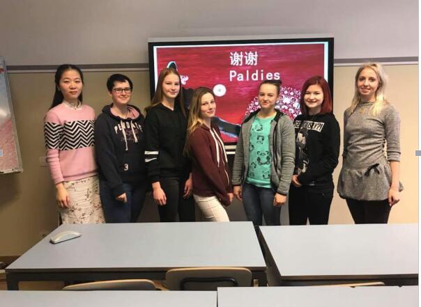2017年9月,文学院对外汉语专业201101班潘玲同学(左一)受国家汉办选派,赴拉脱维亚文茨皮尔斯应用科技大学进行汉语教学。图为中国文化展示课堂上的留影。