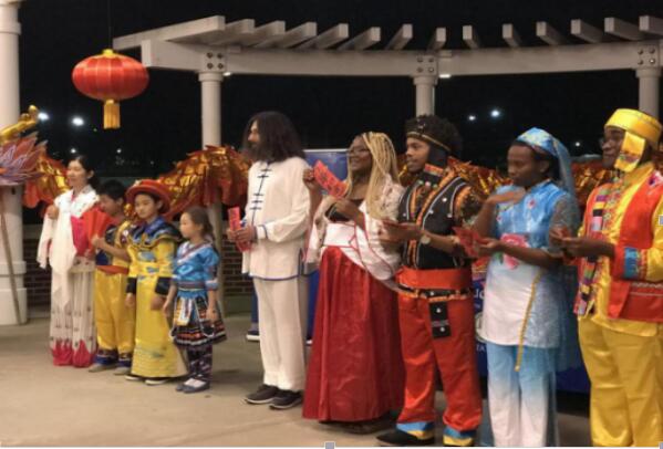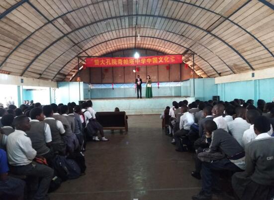 2017年7月,新闻与传播学院杨丽老师(右一)受国家汉办选派,赴赞比亚大学孔子学院地方教学点进行汉语教学。图为杨丽老师主持该校中国文化节文艺演出。