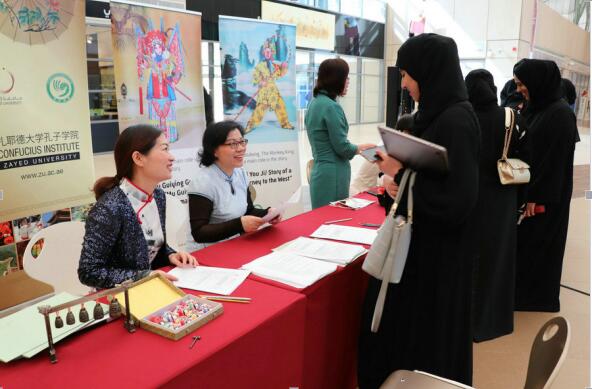 2017年8月,外国语学院蔡红梅老师(左二)受国家汉办选派,赴阿联酋扎耶德大学孔子学院进行汉语教学。图为蔡红梅老师参加扎耶德大学女生校区2018年春季新学期汉语课程推广宣传活动。
