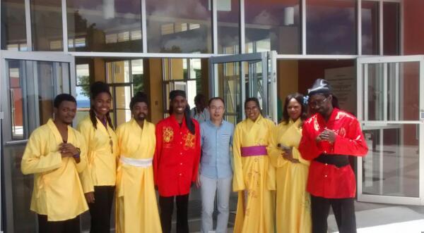 2014年3月,外国语学院徐波(左五)老师受国家汉办选派,赴巴巴多斯西印度大学进行汉语教学。图为徐波老师在西印度大学三校区联合举办的戏剧节上与其指导的学生合影。
