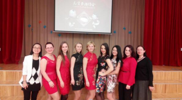 2013年8月至2015年8月,文学院王琼子老师(左一)受国家汉办选派,赴拉脱维亚大学进行汉语教学。图为该校元宵招待会上与大三学生合影。