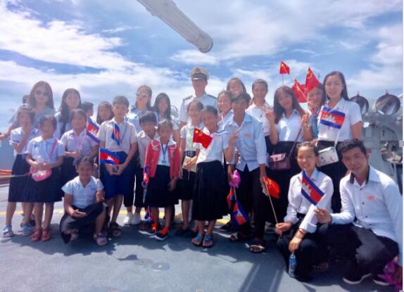 2017年8月,文学院对外汉语专业201301班钱沙同学(后排左一)受国家汉办派选,赴柬埔寨贡布广育学校进行汉语教学。图为钱沙同学和该校师生在柬埔寨欢迎中国海军的场景。