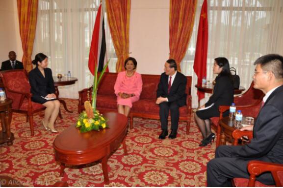 2011年9月,外国语学院何敏老师(左一)受国家汉办选派,赴特立尼达和多巴哥共和国西印度大学进行汉语教学。图为何敏老师在国家副主席、时任中共中央政治局委员、国务院副总理王岐山同志(左三)访特期间担任特多总理卡姆拉·珀塞德-比塞萨尔(Kamla Persad Bissessar)(左二)翻译。