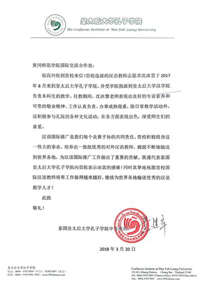 泰国皇太后大学孔子学院中方院长黄建军先生向学校发来公函,高度评价我校学科教学(语文)专业研究生沈冰慧同学在该校的汉语教学工作,并向学校送来良好的祝愿。