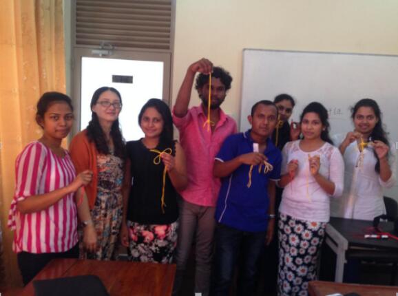 2015年1月至2017年1月,外国语学院程彩兰老师(左二)受国家汉办选派,赴斯里兰卡萨伯拉格穆瓦大学进行汉语教学。图为程彩兰老师教汉语专业学生编中国结。