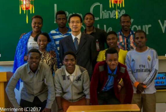 2015年10月,外国语学院罗三林老师(第二排左二)受国家汉办选派,赴非洲赞比亚大学孔子学院进行汉语教学。图为2017年4月赞比亚国家电视台进行汉语教学节目制作时的师生合影。