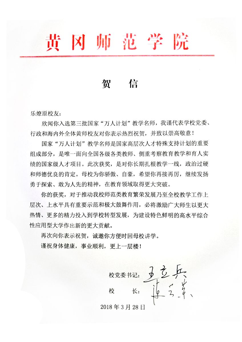 校党委书记王立兵、校长陈兴荣代表学校党委、行政在第一时间给乐燎原校友发出贺信,他们在贺信中说,母校为你骄傲、自豪,希望你再接再厉,继续发扬勇于探索、敢为人先的精神,在教育领域取得更大突破。
