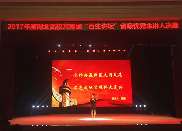 本网讯(通讯员 邓军 冯金丽)3月31日下午,2017年度“百生讲坛”——湖北高校共青团学习习近平新时代中国特色社会主义思想和十九大精神省级优秀主讲人决赛在华中农业大学举办。全省27所高校600余名师生观摩比赛。经过前期的校级遴选初赛、省级预赛、复赛等环节,我校政法学院思政1602班学生程语与来自武汉大学、华中科技大学、华中师范大学等14所高校的18名选手进入决赛,获得优胜奖。