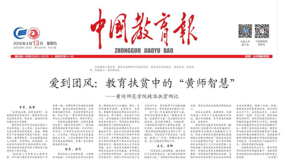 本网讯 4月13日,《中国教育报》第7版环球周刊• 国际教育以《爱到团风:教育扶贫中的“黄师智慧”》为题,从“牵手,扶智”、“躬身,力行”、“立足,深耕”三个视角,系统报道我校站在新的时代方位上,在精准脱贫攻坚战役中,充分发挥高校在人才培养、科学研究、社会服务、文化传承与创新等方面的优势与力量,积极团风县教育扶贫。
