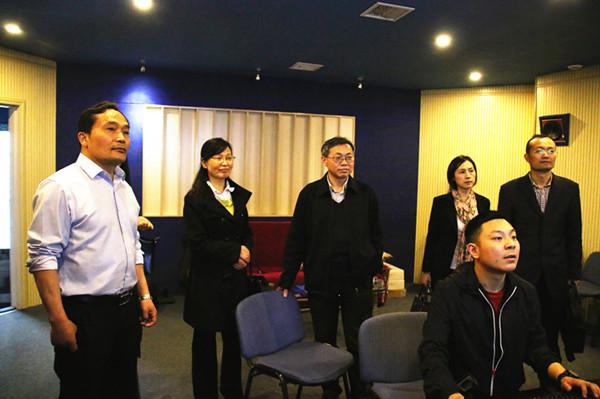 江清和一行先后实地参观了音乐学院音乐厅、多媒体教室、琴房、艺术实践观摩厅、录音棚、舞蹈教室、黄梅戏展厅等教学与实践场地。